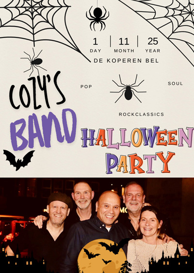 1 november 2025Zoals elk jaar hebben we Cozy Band gevraagd om een Halloween Special voor ons te verzorgen. Kom dus ook naar Restaurant De Koperen Bel voor een onvergetelijke avond. We beginnen om 21:00!